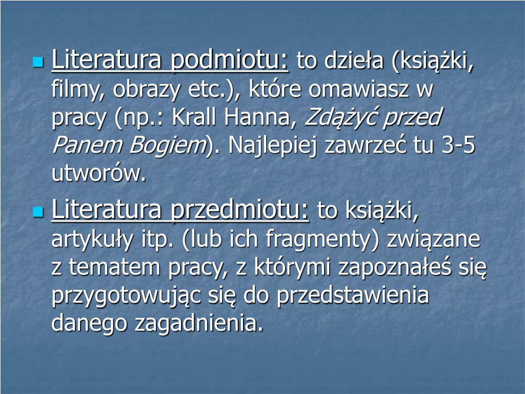 Literatura podmiotu:to dzieła (książki, filmy, obrazy etc.), które omawiasz w pracy (np.: Krall Hanna, Zdążyć przed Panem Bogiem). Najlepiej zawrzeć tu 3-5 utworów. • Literatura przedmiotu:to książki, artykuły itp. (lub ich fragmenty) związane z tematem pracy, z którymi zapoznałeś się przygotowując się do przedstawienia danego zagadnienia.