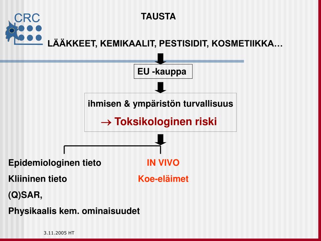 Epidemiologinen tieto Kliininen tieto (Q)SAR, Physikaalis kem. ominaisuudet IN VIVO Koe-eläimet TAUSTA LÄÄKKEET, KEMIKAALIT, PESTISIDIT, KOSMETIIKKA… EU -kauppa ihmisen & ympäristön turvallisuus Toksikologinen riski