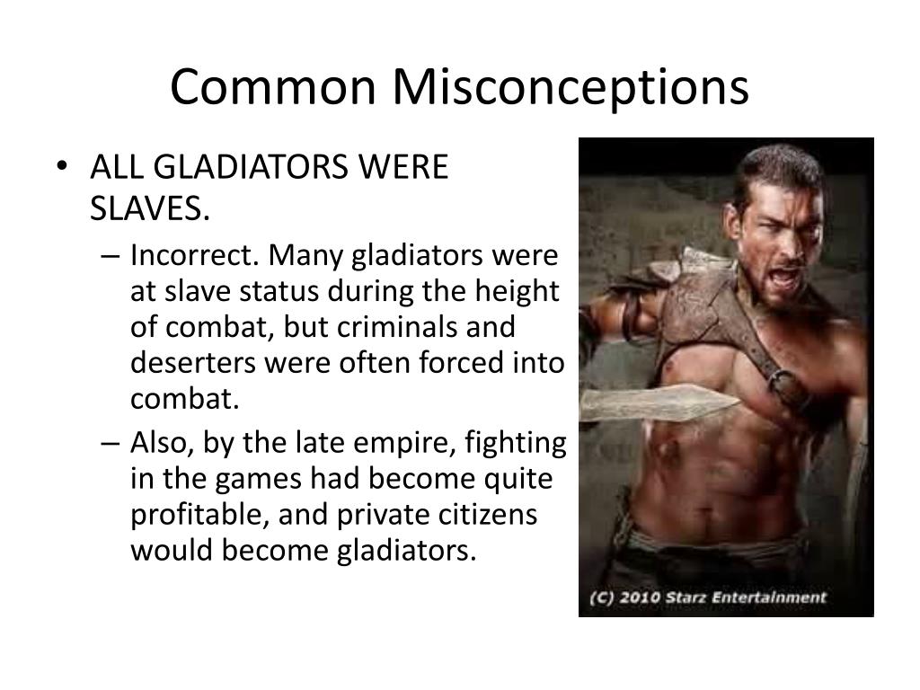 Common Misconceptions • ALL GLADIATORS WERE SLAVES. • Incorrect. Many gladiators were at slave status during the height of combat, but criminals and deserters were often forced into combat. • Also, by the late empire, fighting in the games had become quite profitable, and private citizens would become gladiators.