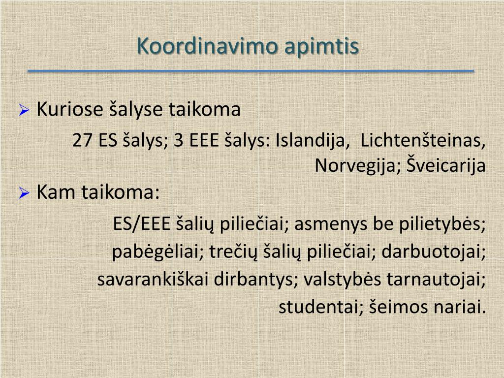 Koordinavimo apimtis • Kuriose šalyse taikoma 27 ES šalys; 3 EEE šalys: Islandija, Lichtenšteinas, Norvegija; Šveicarija • Kam taikoma: ES/EEE šalių piliečiai; asmenys be pilietybės; pabėgėliai; trečių šalių piliečiai; darbuotojai; savarankiškai dirbantys; valstybės tarnautojai; studentai; šeimos nariai.