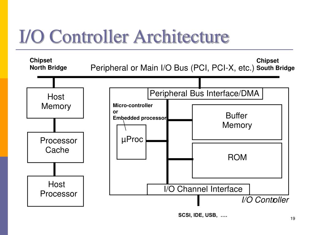 I/O Controller Architecture Chipset North Bridge Chipset South Bridge Peripheral or Main I/O Bus (PCI, PCI-X, etc.) Peripheral Bus Interface/DMA Host Micro-controller or Embedded processor Memory Buf fer Memory µProc Processor Cache ROM Host I/O Channel Interface Processor I/O Contr oller SCSI, IDE, USB, ….