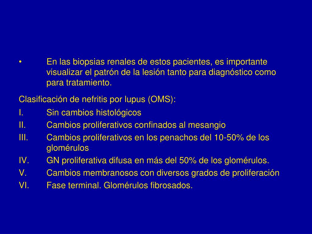 En las biopsias renales de estos pacientes, es importante visualizar el patrón de la lesión tanto para diagnóstico como para tratamiento. Clasificación de nefritis por lupus (OMS): • Sin cambios histológicos • Cambios proliferativos confinados al mesangio • Cambios proliferativos en los penachos del 10-50% de los glomérulos • GN proliferativa difusa en más del 50% de los glomérulos. • Cambios membranosos con diversos grados de proliferación • Fase terminal. Glomérulos fibrosados.