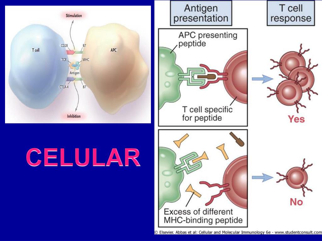Inmunidad adaptativa, 2 tipos de respuesta: • 1. humoral: células B Ac´s. Reconocen Ag extracelulares. • 2. celular : linfocitos T. Principal defensa contra agentes intracelulares. Reconocen Ag´speptídicos unidos por genes en el hospedero en el CMH y que son expresados en superficies celulares
