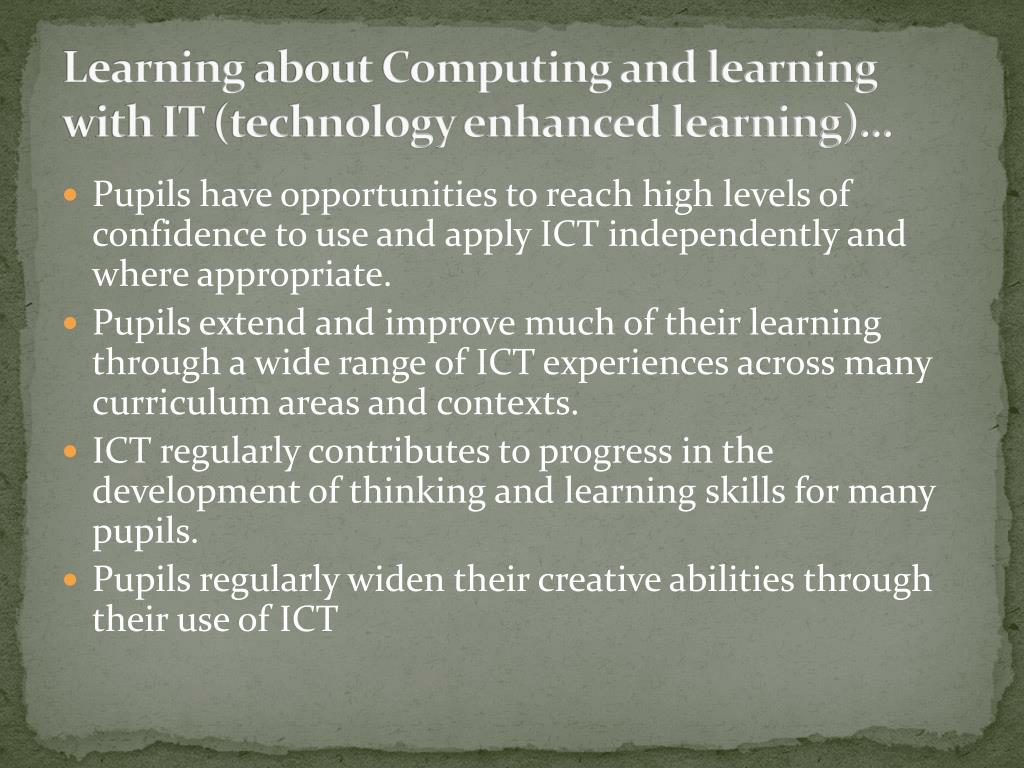 Learningabout Computing and learning with IT (technology enhanced learning)… • Pupils have opportunities to reach high levels of confidence to use and apply ICT independently and where appropriate. • Pupils extend and improve much of their learning through a wide range of ICT experiences across many curriculum areas and contexts. • ICT regularly contributes to progress in the development of thinking and learning skills for many pupils. • Pupils regularly widen their creative abilities through their use of ICT