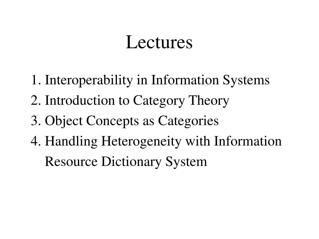 Lectures 1. Interoperability in Information Systems 2. Introduction to Category Theory 3. Object Concepts as Categories 4. Handling Heterogeneity with Information Resource Dictionary System