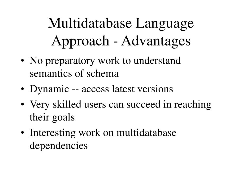 Multidatabase Language Approach - Advantages • No preparatory work to understand semantics of schema • Dynamic -- access latest versions • Very skilled users can succeed in reaching their goals • Interesting work on multidatabase dependencies