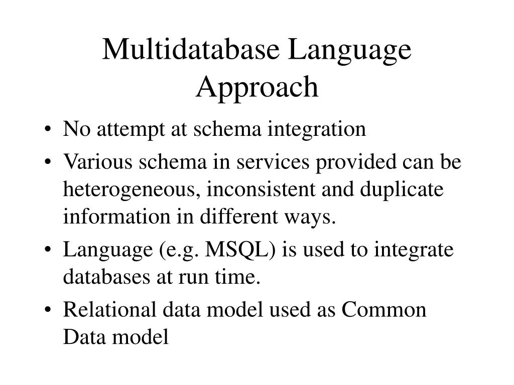 Multidatabase Language Approach • No attempt at schema integration • Various schema in services provided can be heterogeneous, inconsistent and duplicate information in different ways. • Language (e.g. MSQL) is used to integrate databases at run time. • Relational data model used as Common Data model
