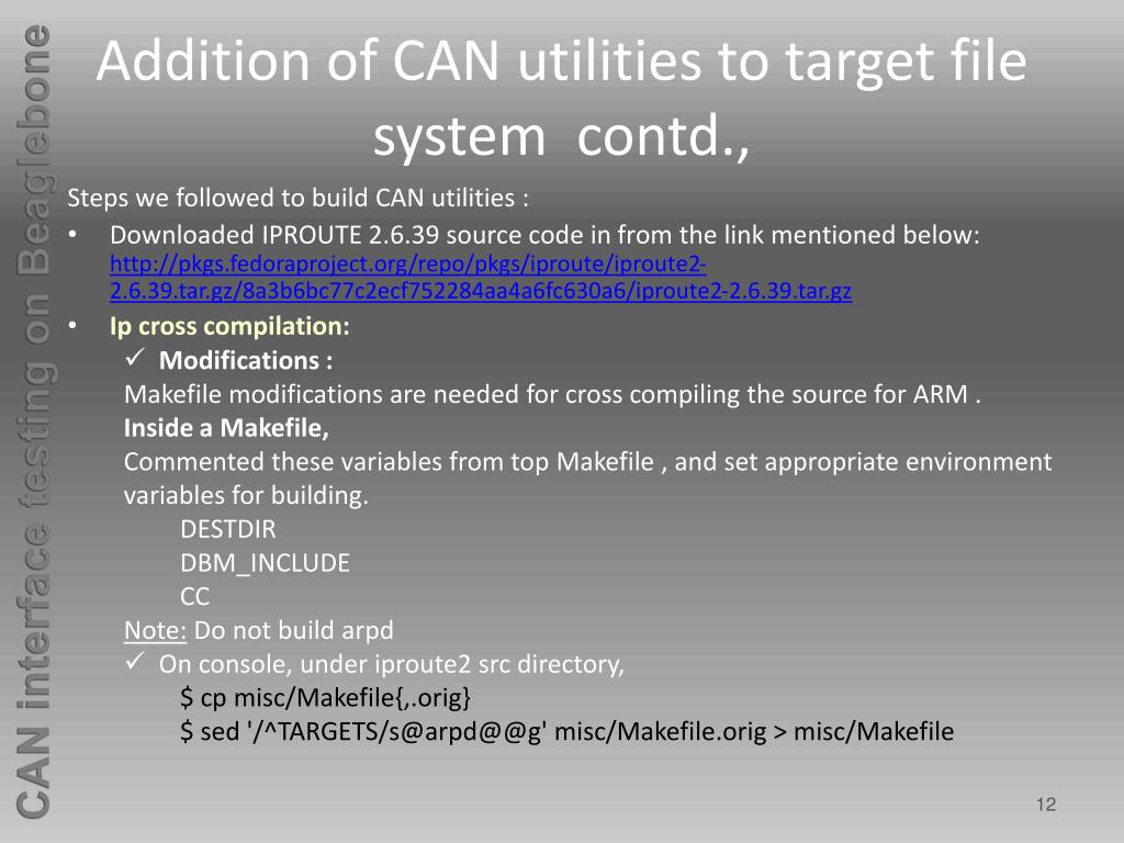 Addition of CAN utilities to target file system contd., Steps we followed to build CAN utilities : • Downloaded IPROUTE 2.6.39 source code in from the link mentioned below: http://pkgs.fedoraproject.org/repo/pkgs/iproute/iproute2-2.6.39.tar.gz/8a3b6bc77c2ecf752284aa4a6fc630a6/iproute2-2.6.39.tar.gz • Ip cross compilation: • Modifications : Makefile modifications are needed for cross compiling the source for ARM . Inside a Makefile, Commented these variables from top Makefile , and set appropriate environment variables for building. DESTDIR DBM_INCLUDE CC Note: Do not build arpd • On console, under iproute2 src directory, $ cp misc/Makefile{,.orig} $ sed '/^TARGETS/s@arpd@@g' misc/Makefile.orig > misc/Makefile