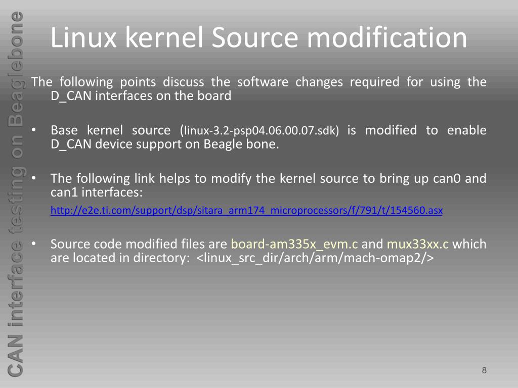 Linux kernel Source modification The following points discuss the software changes required for using the D_CAN interfaces on the board • Base kernel source (linux-3.2-psp04.06.00.07.sdk) is modified to enable D_CAN device support on Beagle bone. • The following link helps to modify the kernel source to bring up can0 and can1 interfaces: http://e2e.ti.com/support/dsp/sitara_arm174_microprocessors/f/791/t/154560.asx • Source code modified files are board-am335x_evm.c and mux33xx.c which are located in directory: <linux_src_dir/arch/arm/mach-omap2/>