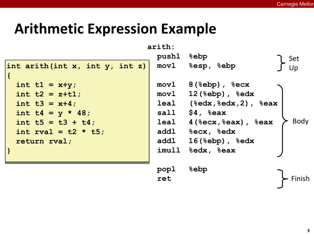 Carnegie Mellon Arithmetic Expression Example arith: pushl %ebp movl %esp, %ebp movl 8(%ebp), %ecx movl 12(%ebp), %edx leal (%edx,%edx,2), %eax sall $4, %eax leal 4(%ecx,%eax), %eax addl %ecx, %edx addl 16(%ebp), %edx imull %edx, %eax popl %ebp ret Set Up intarith(int x, int y, int z) { int t1 = x+y; int t2 = z+t1; int t3 = x+4; int t4 = y * 48; int t5 = t3 + t4; intrval = t2 * t5; return rval; } Body Finish