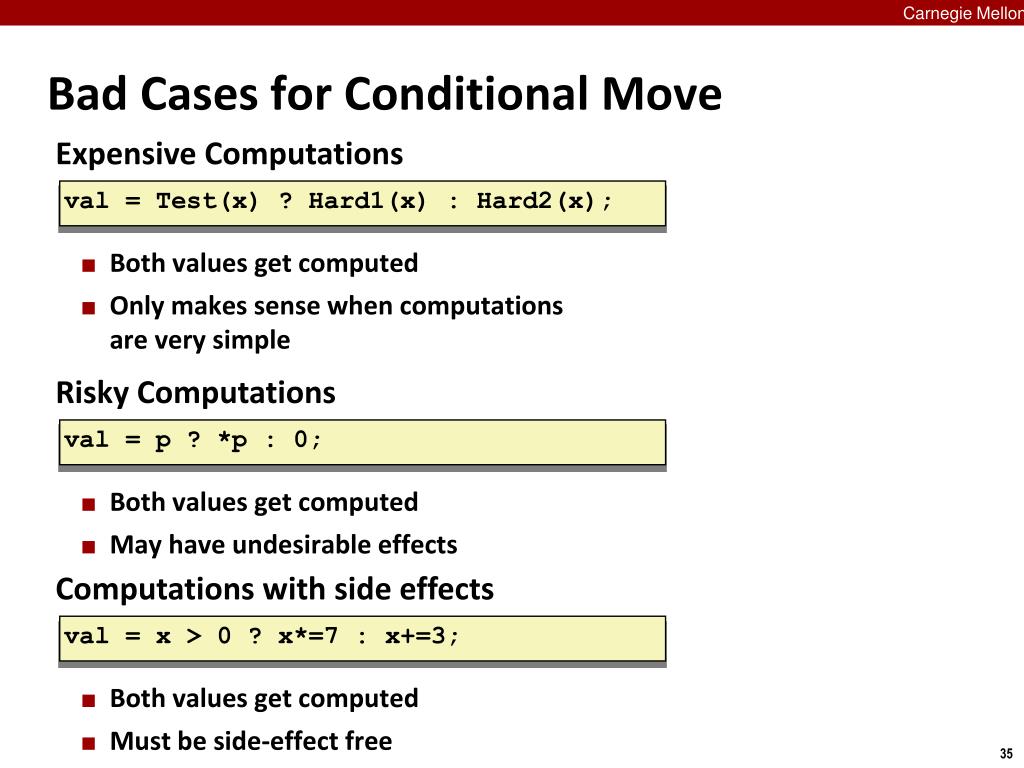 Carnegie Mellon Bad Cases for Conditional Move Expensive Computations • Both values get computed • Only makes sense when computations are very simple val = Test(x)? Hard1(x) : Hard2(x); Risky Computations val = p? *p : 0; • Both values get computed • May have undesirable effects Computations with side effects val= x > 0? x*=7 : x+=3; • Both values get computed • Must be side-effect free