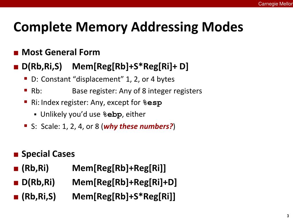 Carnegie Mellon Complete Memory Addressing Modes • Most General Form • D(Rb,Ri,S) Mem[Reg[Rb]+S*Reg[Ri]+ D] • D: Constant “displacement” 1, 2, or 4 bytes • Rb: Base register: Any of 8 integer registers • Ri: Index register: Any, except for %esp • Unlikely you’d use %ebp, either • S: Scale: 1, 2, 4, or 8 (why these numbers?) • Special Cases • (Rb,Ri) Mem[Reg[Rb]+Reg[Ri]] • D(Rb,Ri) Mem[Reg[Rb]+Reg[Ri]+D] • (Rb,Ri,S) Mem[Reg[Rb]+S*Reg[Ri]]