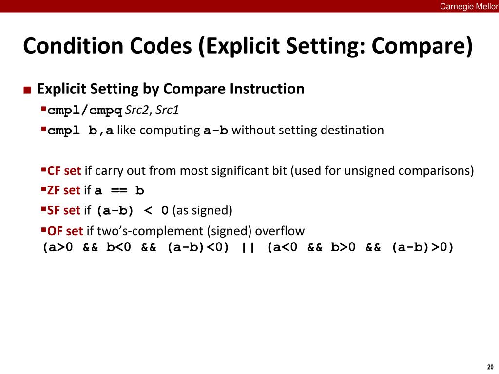 Carnegie Mellon Condition Codes (Explicit Setting: Compare) • Explicit Setting by Compare Instruction • cmpl/cmpqSrc2, Src1 • cmpl b,a like computing a-b without setting destination • CF set if carry out from most significant bit (used for unsigned comparisons) • ZF set if a == b • SF set if (a-b) < 0 (as signed) • OF set if two’s-complement (signed) overflow(a>0 && b<0 && (a-b)<0) || (a<0 && b>0 && (a-b)>0)