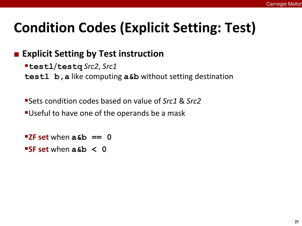 Carnegie Mellon Condition Codes (Explicit Setting: Test) • Explicit Setting by Test instruction • testl/testqSrc2, Src1testl b,a like computing a&b without setting destination • Sets condition codes based on value of Src1 & Src2 • Useful to have one of the operands be a mask • ZF set when a&b == 0 • SF set when a&b < 0
