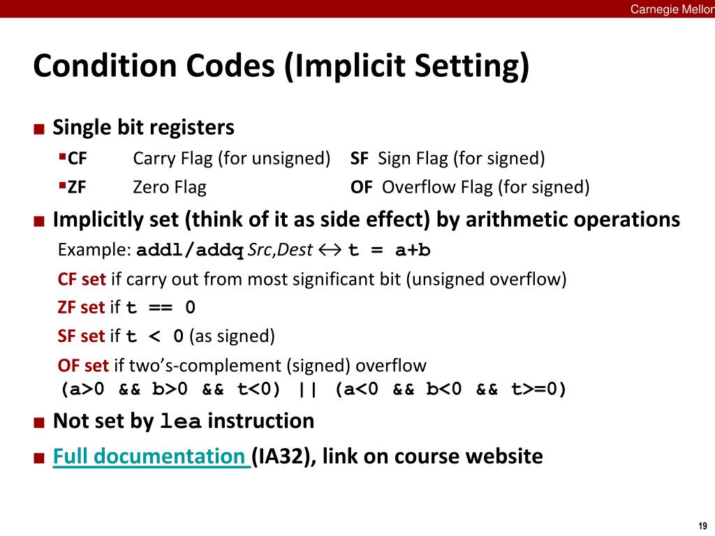 Carnegie Mellon Condition Codes (Implicit Setting) • Single bit registers • CF Carry Flag (for unsigned) SF Sign Flag (for signed) • ZF Zero Flag OF Overflow Flag (for signed) • Implicitly set (think of it as side effect) by arithmetic operations Example: addl/addqSrc,Dest ↔ t = a+b CF set if carry out from most significant bit (unsigned overflow) ZF set if t == 0 SF set if t < 0 (as signed) OF set if two’s-complement (signed) overflow(a>0 && b>0 && t<0) || (a<0 && b<0 && t>=0) • Not set by lea instruction • Full documentation (IA32), link on course website