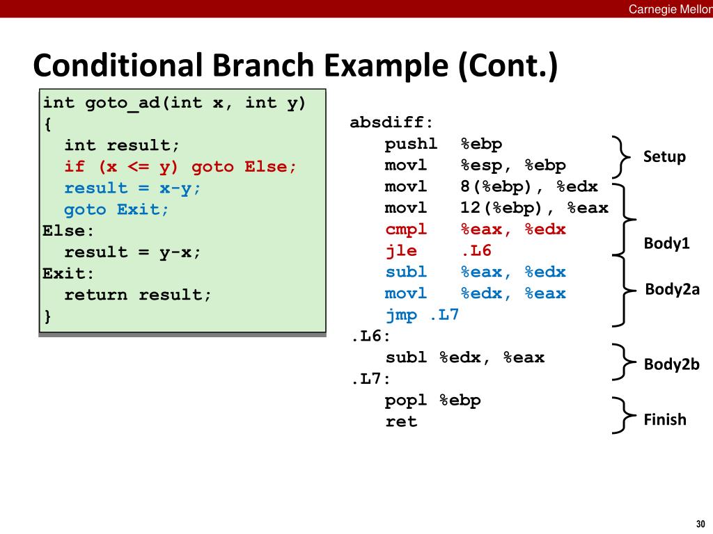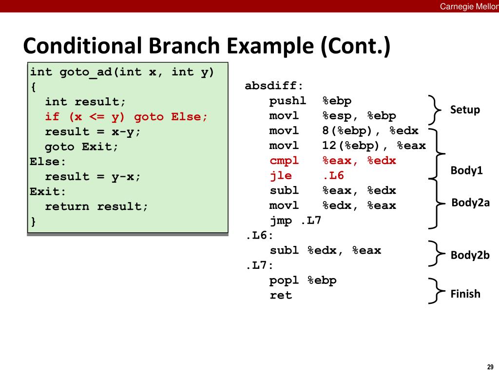 Carnegie Mellon Conditional Branch Example (Cont.) intgoto_ad(int x, int y) { int result; if (x <= y) gotoElse; result = x-y; goto Exit; Else: result = y-x; Exit: return result; } absdiff: pushl %ebp movl %esp, %ebp movl 8(%ebp), %edx movl 12(%ebp), %eax cmpl %eax, %edx jle .L6 subl %eax, %edx movl %edx, %eax jmp .L7 .L6: subl %edx, %eax .L7: popl %ebp ret Setup Body1 Body2a Body2b Finish
