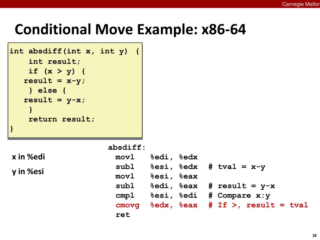 Carnegie Mellon Conditional Move Example: x86-64 intabsdiff(intx, int y){ int result; if (x > y) { result = x-y; } else { result = y-x; } return result; } absdiff: movl %edi, %edx subl %esi, %edx# tval = x-y movl %esi, %eax subl %edi, %eax # result = y-x cmpl %esi, %edi # Compare x:y cmovg %edx, %eax # If >, result = tval ret x in %edi y in %esi