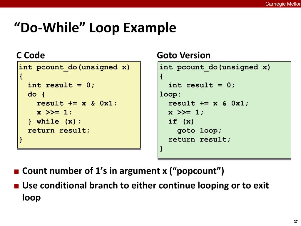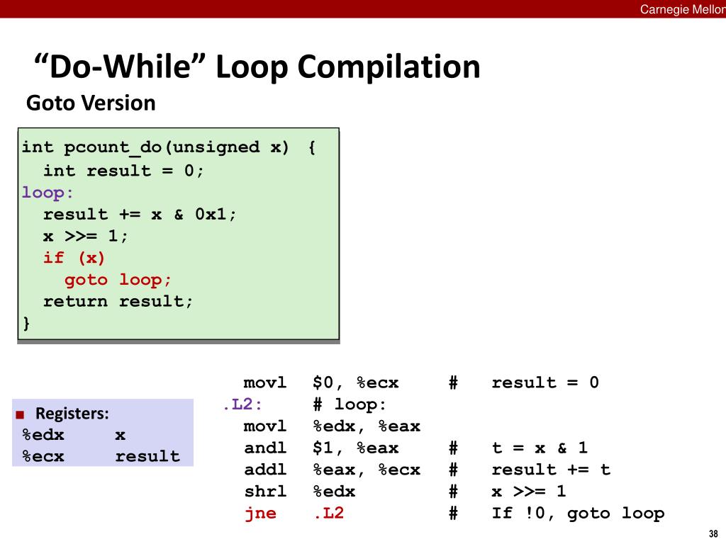 Carnegie Mellon “Do-While” Loop Compilation Goto Version • Registers: %edxx %ecxresult intpcount_do(unsigned x){ int result = 0; loop: result += x & 0x1; x >>= 1; if (x) goto loop; return result; } movl $0, %ecx # result = 0 .L2: # loop: movl %edx, %eax andl $1, %eax # t = x & 1 addl %eax, %ecx # result += t shrl %edx # x >>= 1 jne .L2 # If !0, goto loop