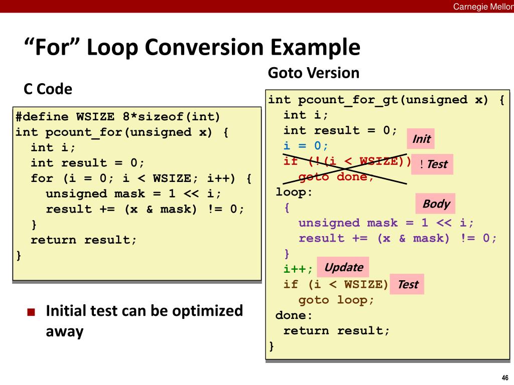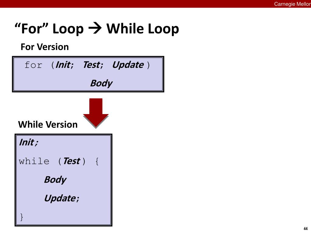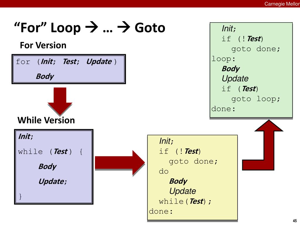Carnegie Mellon “For” Loop … Goto Init; if (!Test) gotodone; loop: Body Update if (Test) gotoloop; done: For Version for (Init; Test; Update) Body While Version Init; while (Test ) { Body Update; } Init; if (!Test) gotodone; do Body Update while(Test); done: