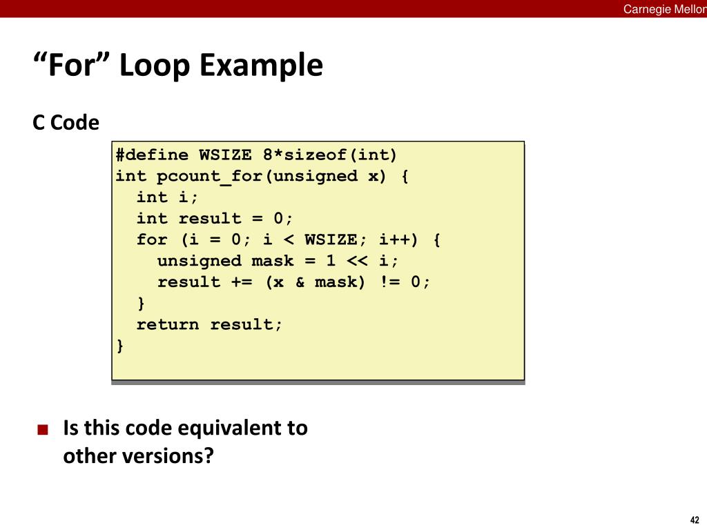 Is this code equivalent to other versions? Carnegie Mellon “For” Loop Example C Code #define WSIZE 8*sizeof(int) intpcount_for(unsigned x) { inti; int result = 0; for (i = 0; i < WSIZE; i++) { unsigned mask = 1 << i; result += (x & mask) != 0; } return result; }