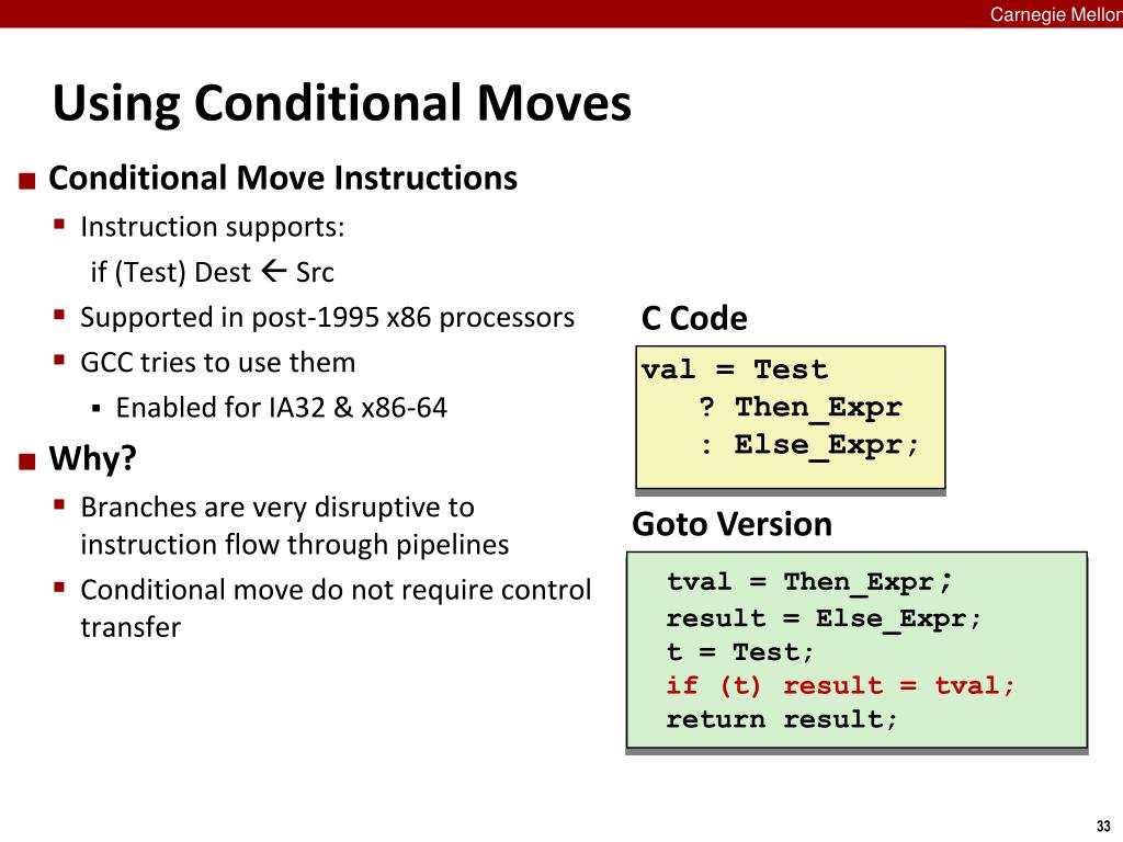 Carnegie Mellon Using Conditional Moves • Conditional Move Instructions • Instruction supports: if (Test) Dest Src • Supported in post-1995 x86 processors • GCC tries to use them • Enabled for IA32 & x86-64 • Why? • Branches are very disruptive to instruction flow through pipelines • Conditional move do not require control transfer C Code val = Test ? Then_Expr : Else_Expr; Goto Version tval = Then_Expr; result = Else_Expr; t = Test; if (t) result = tval; return result;