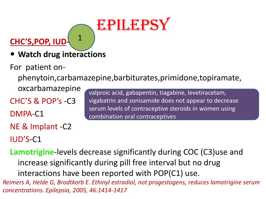 Epilepsy 1 CHC’S,POP, IUD-C1 • Watch drug interactions For patient on- phenytoin,carbamazepine,barbiturates,primidone,topiramate,oxcarbamazepine CHC’S & POP’s -C3 DMPA-C1 NE & Implant -C2 IUD’S-C1 Lamotrigine-levels decrease significantly during COC (C3)use and increase significantly during pill free interval but no drug interactions have been reported with POP(C1) use. valproic acid, gabapentin, tiagabine, levetiracetam, vigabatrin and zonisamide does not appear to decrease serum levels of contraceptive steroids in women using combination oral contraceptives Reimers A, Helde G, Brodtkorb E. Ethinyl estradiol, not progestogens, reduces lamotrigine serum concentrations. Epilepsia, 2005, 46:1414-1417