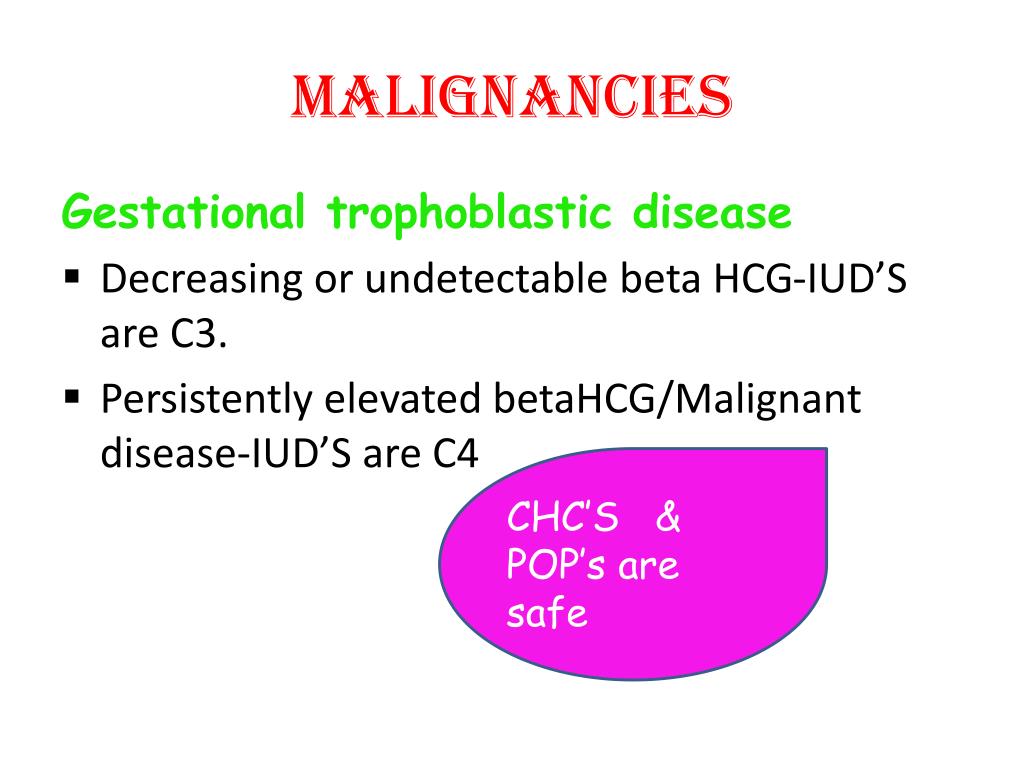 Malignancies Gestational trophoblastic disease • Decreasing or undetectable beta HCG-IUD’S are C3. • Persistently elevated betaHCG/Malignant disease-IUD’S are C4 CHC’S & POP’s are safe