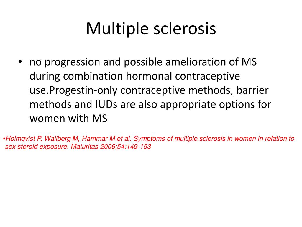 Multiple sclerosis • no progression and possible amelioration of MS during combination hormonal contraceptive use.Progestin-only contraceptive methods, barrier methods and IUDs are also appropriate options for women with MS • Holmqvist P, Wallberg M, Hammar M et al. Symptoms of multiple sclerosis in women in relation to sex steroid exposure. Maturitas 2006;54:149-153
