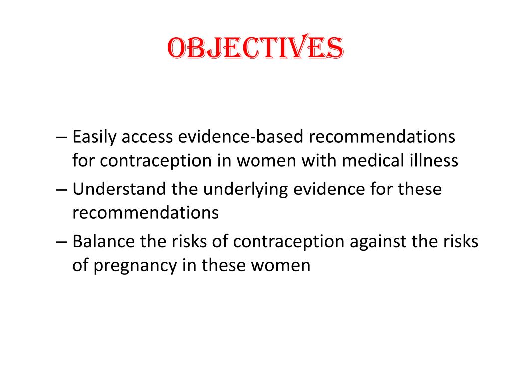 Objectives • Easily access evidence-based recommendations for contraception in women with medical illness • Understand the underlying evidence for these recommendations • Balance the risks of contraception against the risks of pregnancy in these women