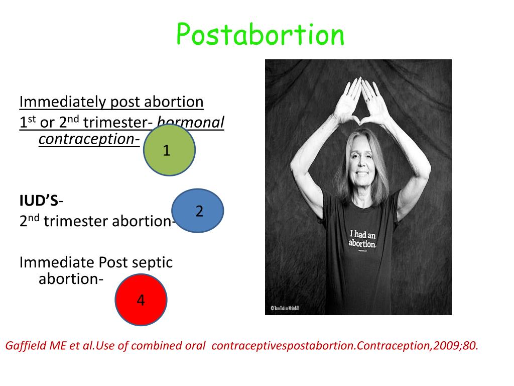 Postabortion Immediately post abortion 1st or 2nd trimester- hormonal contraception- IUD’S- 2nd trimester abortion- Immediate Post septic abortion- Gaffield ME et al.Use of combined oral contraceptivespostabortion.Contraception,2009;80. 1 2 4