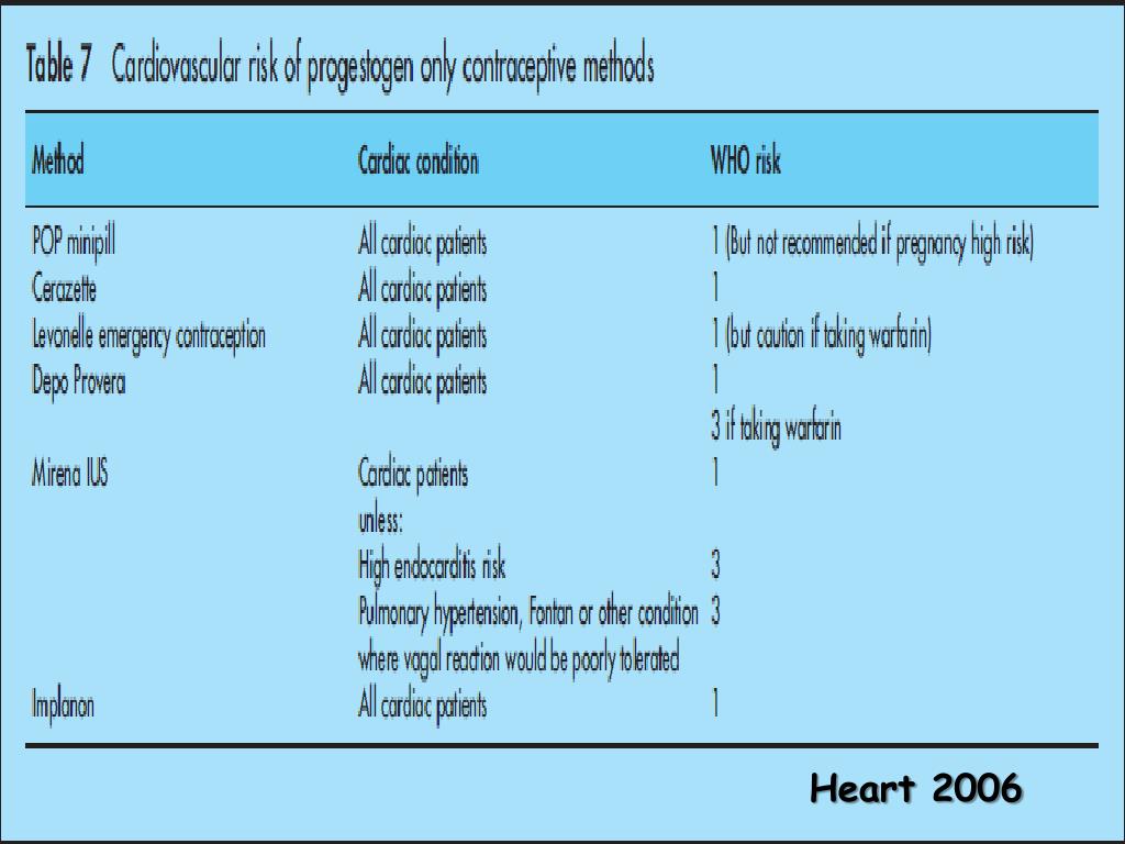 Heart disease &Contraception • Intrauterine devices are not indicated in patients at risk for endocarditis, valvular prostheses, or receiving chronic anticoagulation. • Hormonal contraception :thrombosis -15% in cyanotic patients • Interaction between OCP and anticoagulants (warfarin). • Interaction between Bosentan and POPs. • ?Parenteralcontraception(Mirena) - low profile of complications.