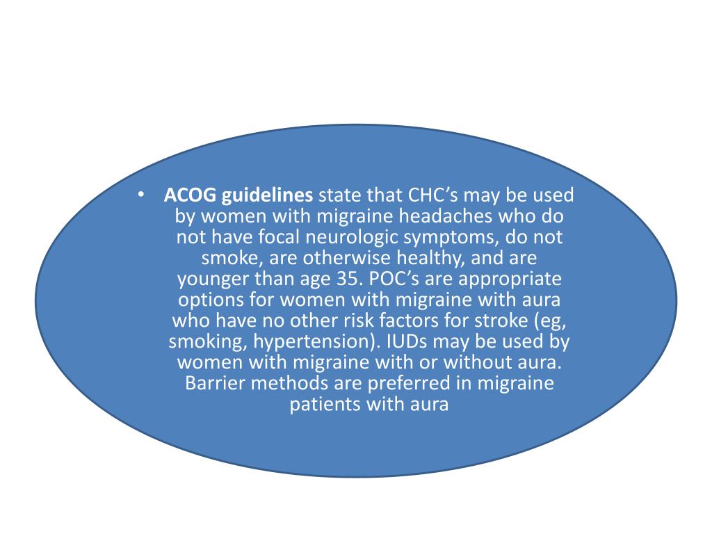 ACOG guidelines state that CHC’s may be used by women with migraine headaches who do not have focal neurologic symptoms, do not smoke, are otherwise healthy, and are younger than age 35. POC’s are appropriate options for women with migraine with aura who have no other risk factors for stroke (eg, smoking, hypertension). IUDs may be used by women with migraine with or without aura. Barrier methods are preferred in migraine patients with aura