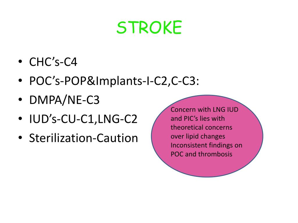 STROKE • CHC’s-C4 • POC’s-POP&Implants-I-C2,C-C3: • DMPA/NE-C3 • IUD’s-CU-C1,LNG-C2 • Sterilization-Caution Concern with LNG IUD and PIC’s lies with theoretical concerns over lipid changes Inconsistent findings on POC and thrombosis