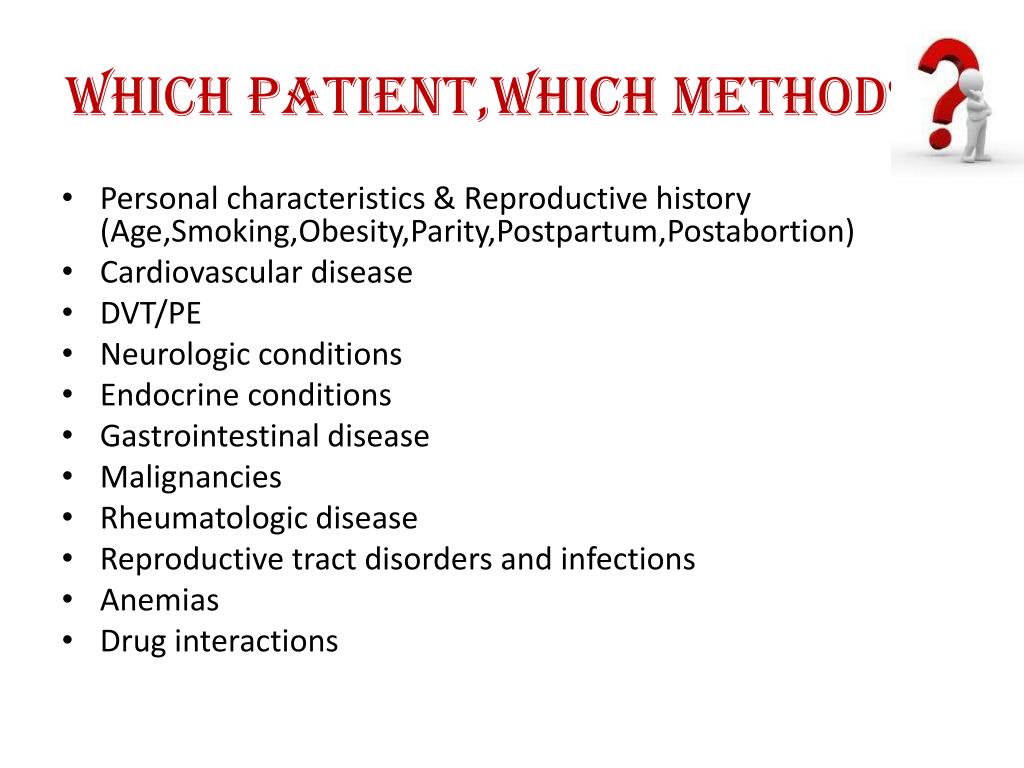 Which patient,Which method?… • Personal characteristics & Reproductive history (Age,Smoking,Obesity,Parity,Postpartum,Postabortion) • Cardiovascular disease • DVT/PE • Neurologic conditions • Endocrine conditions • Gastrointestinal disease • Malignancies • Rheumatologic disease • Reproductive tract disorders and infections • Anemias • Drug interactions