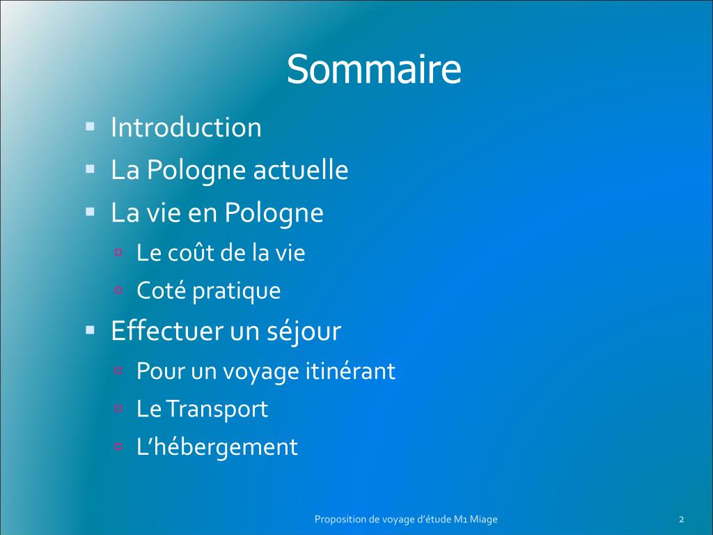 Sommaire • Introduction • La Pologne actuelle • La vie en Pologne • Le coût de la vie • Coté pratique • Effectuer un séjour • Pour un voyage itinérant • Le Transport • L’hébergement Proposition de voyage d’étude M1 Miage