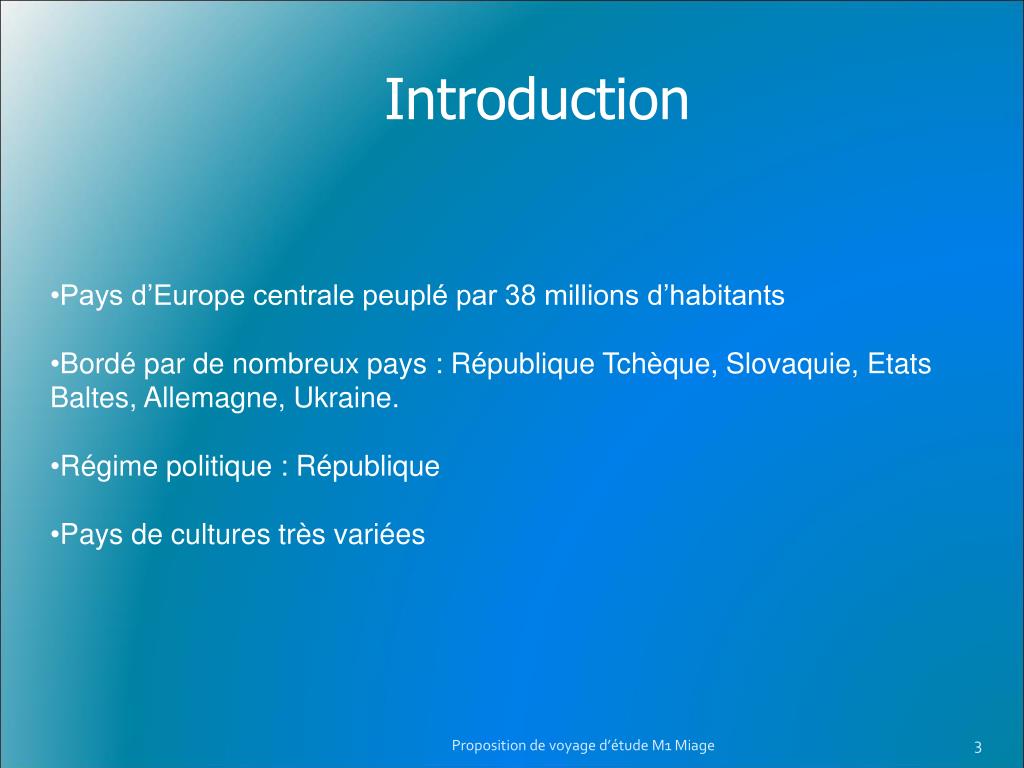 Introduction • Pays d’Europe centrale peuplé par 38 millions d’habitants • Bordé par de nombreux pays : République Tchèque, Slovaquie, Etats Baltes, Allemagne, Ukraine. • Régime politique : République • Pays de cultures très variées Proposition de voyage d’étude M1 Miage