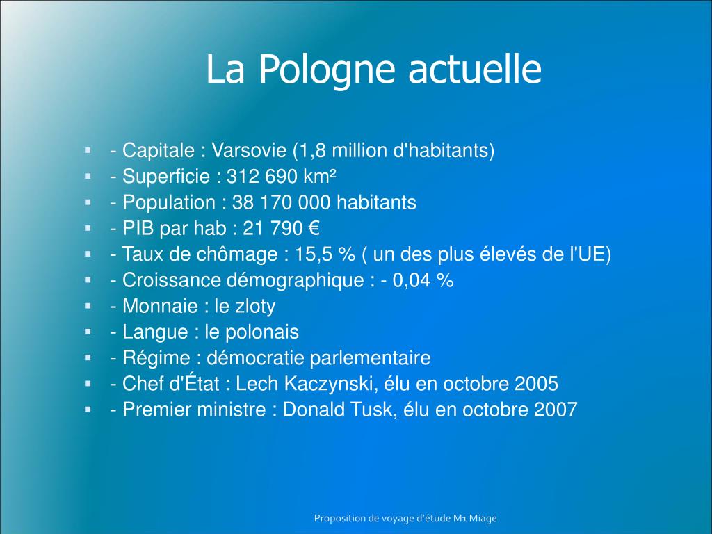 La Pologne actuelle • - Capitale : Varsovie (1,8 million d'habitants) • - Superficie : 312 690 km² • - Population : 38 170 000 habitants • - PIB par hab : 21 790 € • - Taux de chômage : 15,5 % ( un des plus élevés de l'UE) • - Croissance démographique : - 0,04 % • - Monnaie : le zloty • - Langue : le polonais • - Régime : démocratie parlementaire • - Chef d'État : Lech Kaczynski, élu en octobre 2005 • - Premier ministre : Donald Tusk, élu en octobre 2007 Proposition de voyage d’étude M1 Miage