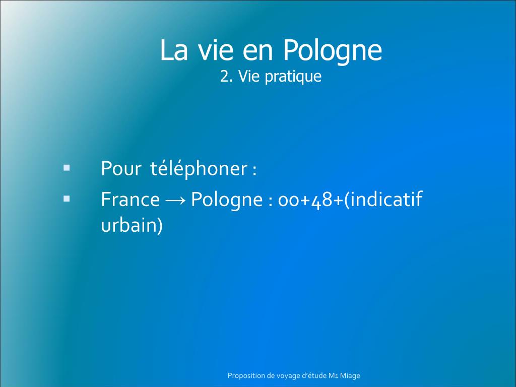 La vie en Pologne2. Vie pratique • Pour téléphoner : • France → Pologne : 00+48+(indicatif urbain) Proposition de voyage d’étude M1 Miage