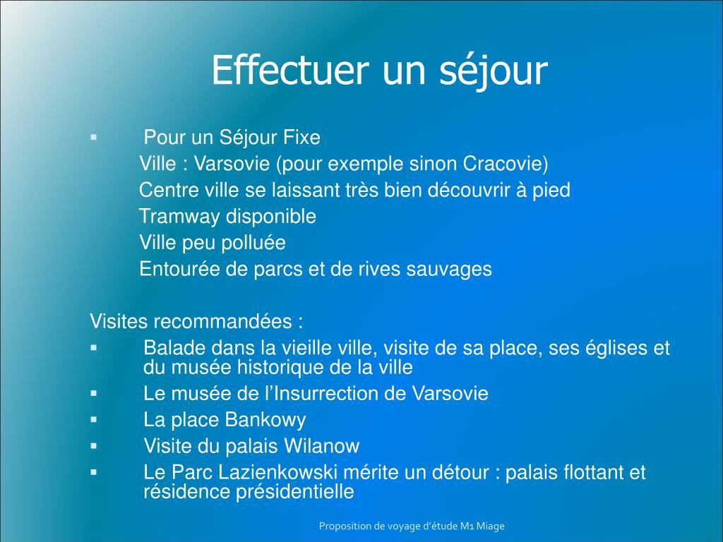 Effectuer un séjour • Pour un Séjour Fixe Ville : Varsovie (pour exemple sinon Cracovie) Centre ville se laissant très bien découvrir à pied Tramway disponible Ville peu polluée Entourée de parcs et de rives sauvages Visites recommandées : • Balade dans la vieille ville, visite de sa place, ses églises et du musée historique de la ville • Le musée de l’Insurrection de Varsovie • La place Bankowy • Visite du palais Wilanow • Le Parc Lazienkowski mérite un détour : palais flottant et résidence présidentielle Proposition de voyage d’étude M1 Miage