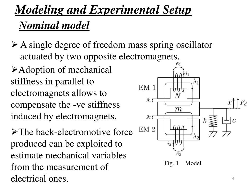 Modeling and Experimental Setup Nominal model • A single degree of freedom mass spring oscillator actuated by two opposite electromagnets. • Adoption of mechanical stiffness in parallel to electromagnets allows to compensate the -ve stiffness induced by electromagnets. • The back-electromotive force produced can be exploited to estimate mechanical variables from the measurement of electrical ones. Fig. 1 Model