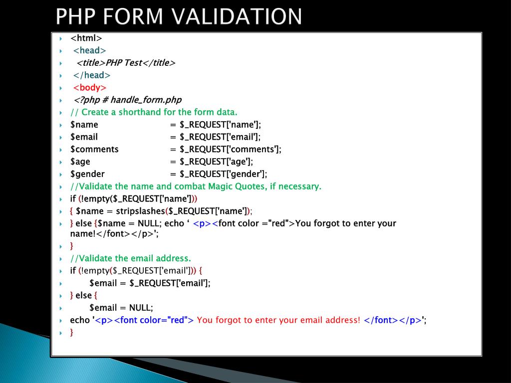 PHP FORM VALIDATION • <html> • <head> • <title>PHP Test</title> • </head> • <body> • <?php # handle_form.php • // Create a shorthand for the form data. • $name = $_REQUEST['name']; • $email = $_REQUEST['email']; • $comments = $_REQUEST['comments']; • $age = $_REQUEST['age']; • $gender = $_REQUEST['gender']; • //Validate the name and combat Magic Quotes, if necessary. • if(!empty($_REQUEST['name'])) • { $name = stripslashes($_REQUEST['name']); • }else{$name = NULL; echo ‘ <p><font color ="red">You forgot to enter your name!</font></p>'; • } • //Validate the email address. • if(!empty($_REQUEST['email'])) { • $email = $_REQUEST['email']; • }else{ • $email = NULL; • echo'<p><font color="red"> You forgot to enter your email address! </font></p>'; • }