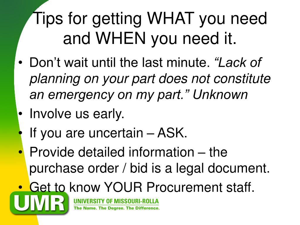 Tips for getting WHAT you need and WHEN you need it. • Don’t wait until the last minute. “Lack of planning on your part does not constitute an emergency on my part.” Unknown • Involve us early. • If you are uncertain – ASK. • Provide detailed information – the purchase order / bid is a legal document. • Get to know YOUR Procurement staff.