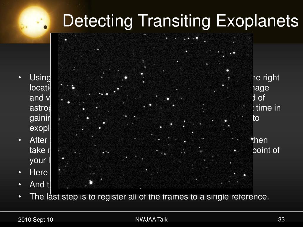 Basic Procedure • Using the finder chart, you must first point the telescope at the right location, mount the camera and focus it, and then take an image and verify the pointing. These are steps needed for any kind of astrophotography, and I strongly recommend that you invest time in gaining experience with astrophotography before jumping into exoplanet detection. • After getting your first image and verifying pointing, you will then take multiple exposures, each of which will provide a single point of your light curve. • Here is a single (uncalibrated) image of TrES-3 • And that same frame calibrated. • The last step is to register all of the frames to a single reference. NWJAA Talk
