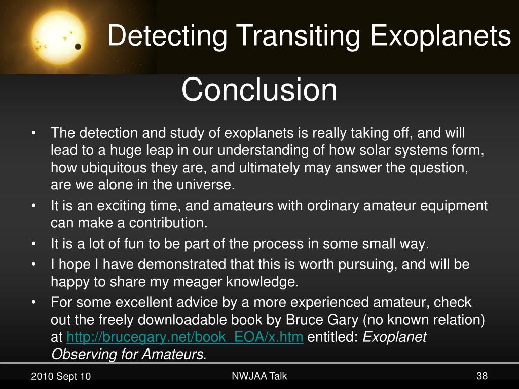 Conclusion • The detection and study of exoplanets is really taking off, and will lead to a huge leap in our understanding of how solar systems form, how ubiquitous they are, and ultimately may answer the question, are we alone in the universe. • It is an exciting time, and amateurs with ordinary amateur equipment can make a contribution. • It is a lot of fun to be part of the process in some small way. • I hope I have demonstrated that this is worth pursuing, and will be happy to share my meager knowledge. • For some excellent advice by a more experienced amateur, check out the freely downloadable book by Bruce Gary (no known relation) at http://brucegary.net/book_EOA/x.htm entitled: Exoplanet Observing for Amateurs. NWJAA Talk