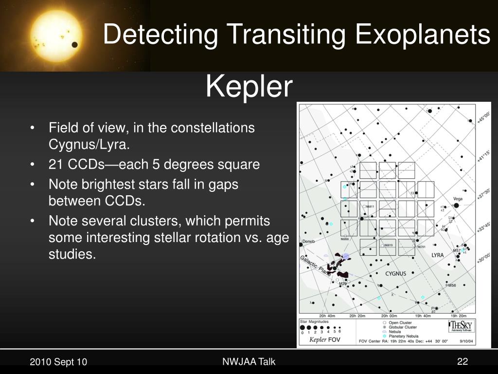 Kepler • Field of view, in the constellations Cygnus/Lyra. • 21 CCDs—each 5 degrees square • Note brightest stars fall in gaps between CCDs. • Note several clusters, which permits some interesting stellar rotation vs. age studies. NWJAA Talk