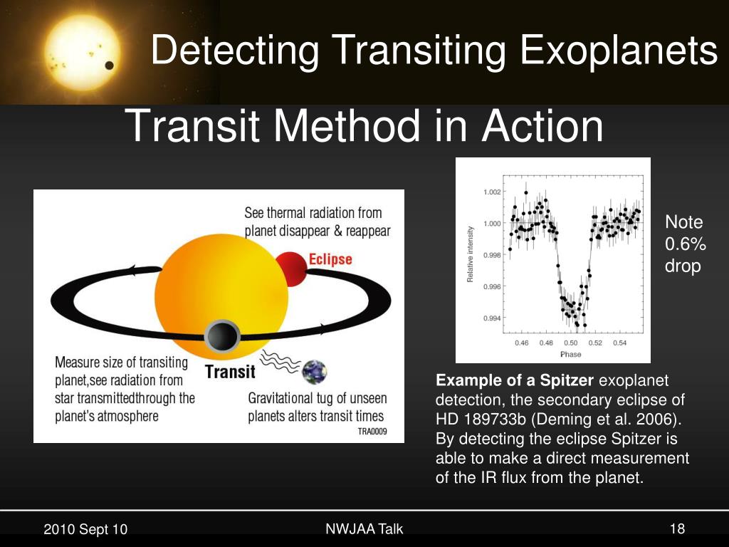 Transit Method in Action Note 0.6% drop Example of a Spitzer exoplanetdetection, the secondary eclipse of HD 189733b (Deming et al. 2006). By detecting the eclipse Spitzer is able to make a direct measurement of the IR flux from the planet. NWJAA Talk