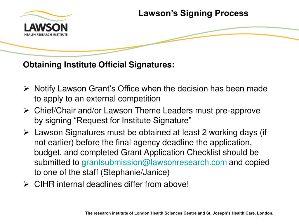 Lawson’s Signing Process Obtaining Institute Official Signatures: Notify Lawson Grant’s Office when the decision has been made to apply to an external competition Chief/Chair and/or Lawson Theme Leaders must pre-approve by signing “Request for Institute Signature” Lawson Signatures must be obtained at least 2 working days (if not earlier) before the final agency deadline the application, budget, and completed Grant Application Checklist should be submitted to grantsubmission@lawsonresearch.com and copied to one of the staff (Stephanie/Janice) CIHR internal deadlines differ from above!