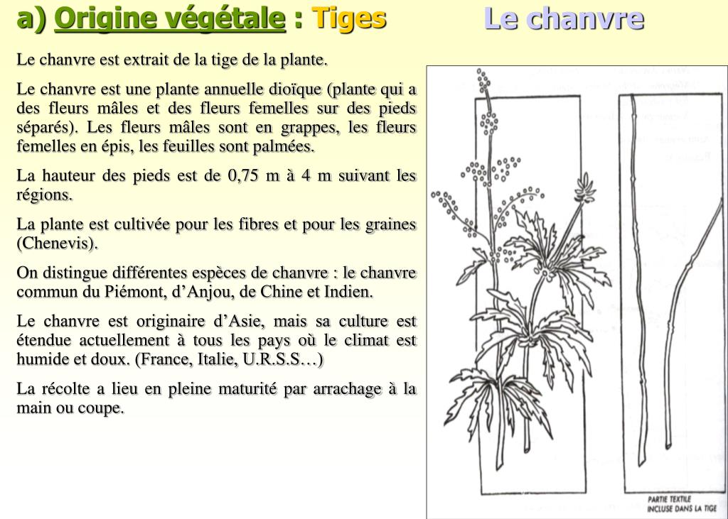 a) Origine végétale :Tiges Le chanvre Le chanvre est extrait de la tige de la plante. Le chanvre est une plante annuelle dioïque (plante qui a des fleurs mâles et des fleurs femelles sur des pieds séparés). Les fleurs mâles sont en grappes, les fleurs femelles en épis, les feuilles sont palmées. La hauteur des pieds est de 0,75 m à 4 m suivant les régions. La plante est cultivée pour les fibres et pour les graines (Chenevis). On distingue différentes espèces de chanvre : le chanvre commun du Piémont, d’Anjou, de Chine et Indien. Le chanvre est originaire d’Asie, mais sa culture est étendue actuellement à tous les pays où le climat est humide et doux. (France, Italie, U.R.S.S…) La récolte a lieu en pleine maturité par arrachage à la main ou coupe.
