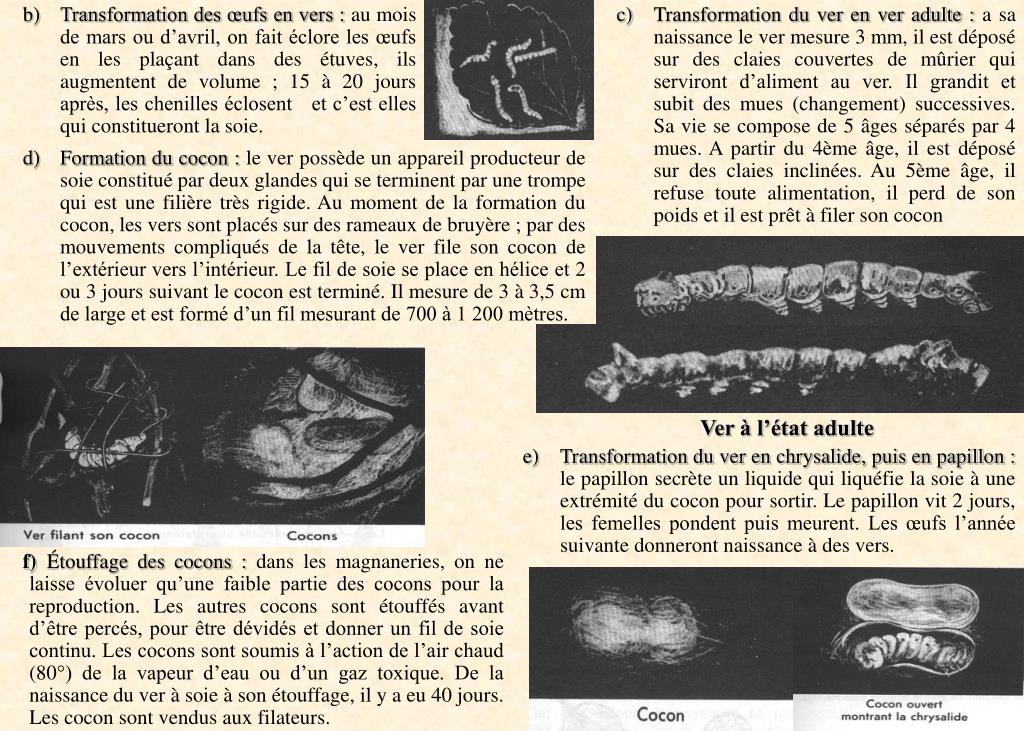 Transformation des œufs en vers : au mois de mars ou d’avril, on fait éclore les œufs en les plaçant dans des étuves, ils augmentent de volume ; 15 à 20 jours après, les chenilles éclosent et c’est elles qui constitueront la soie. Transformation du ver en ver adulte :a sa naissance le ver mesure 3 mm, il est déposé sur des claies couvertes de mûrier qui serviront d’aliment au ver. Il grandit et subit des mues (changement) successives. Sa vie se compose de 5 âges séparés par 4 mues. A partir du 4ème âge, il est déposé sur des claies inclinées. Au 5ème âge, il refuse toute alimentation, il perd de son poids et il est prêt à filer son cocon Formation du cocon :le ver possède un appareil producteur de soie constitué par deux glandes qui se terminent par une trompe qui est une filière très rigide. Au moment de la formation du cocon, les vers sont placés sur des rameaux de bruyère ; par des mouvements compliqués de la tête, le ver file son cocon de l’extérieur vers l’intérieur. Le fil de soie se place en hélice et 2 ou 3 jours suivant le cocon est terminé. Il mesure de 3 à 3,5 cm de large et est formé d’un fil mesurant de 700 à 1 200 mètres. Ver à l’état adulte Transformation du ver en chrysalide, puis en papillon :le papillon secrète un liquide qui liquéfie la soie à une extrémité du cocon pour sortir. Le papillon vit 2 jours, les femelles pondent puis meurent. Les œufs l’année suivante donneront naissance à des vers. Étouffage des cocons :dans les magnaneries, on ne laisse évoluer qu’une faible partie des cocons pour la reproduction. Les autres cocons sont étouffés avant d’être percés, pour être dévidés et donner un fil de soie continu. Les cocons sont soumis à l’action de l’air chaud (80°) de la vapeur d’eau ou d’un gaz toxique. De la naissance du ver à soie à son étouffage, il y a eu 40 jours. Les cocon sont vendus aux filateurs.