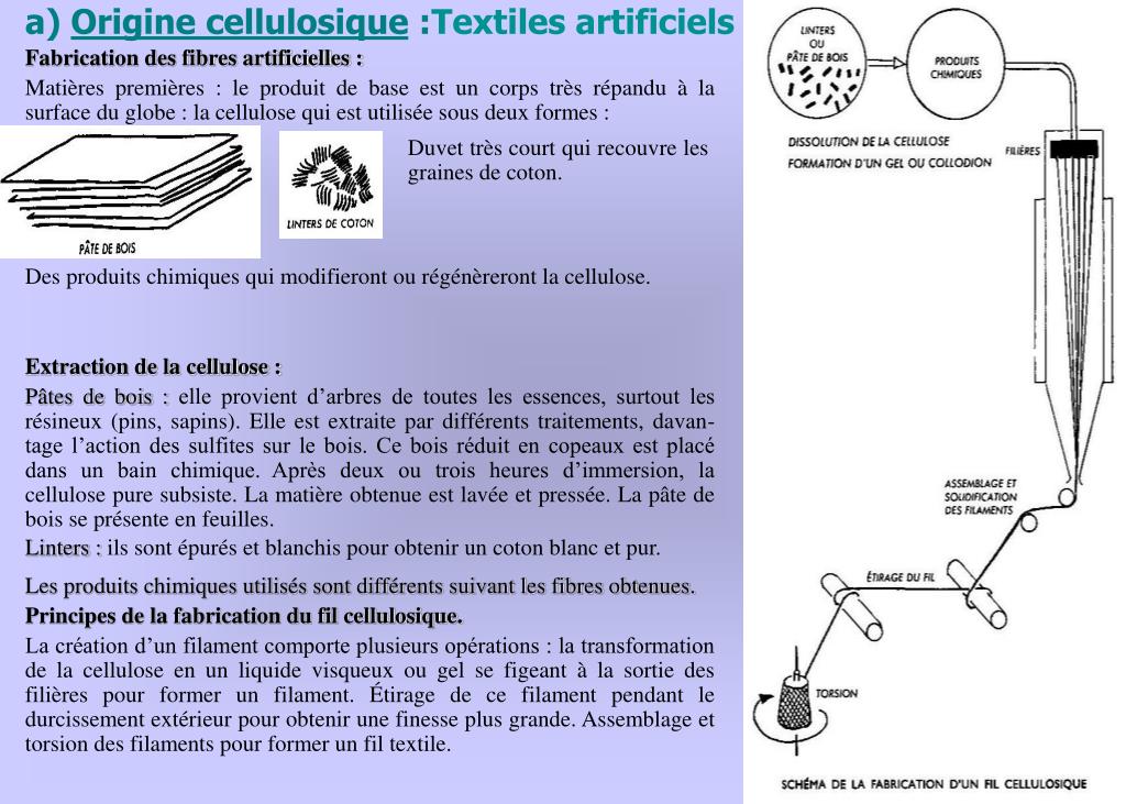 a) Origine cellulosique : Textiles artificiels Fabrication des fibres artificielles : Matières premières : le produit de base est un corps très répandu à la surface du globe : la cellulose qui est utilisée sous deux formes : Duvet très court qui recouvre les graines de coton. Des produits chimiques qui modifieront ou régénèreront la cellulose. Extraction de la cellulose : Pâtes de bois : elle provient d’arbres de toutes les essences, surtout les résineux (pins, sapins). Elle est extraite par différents traitements, davan-tage l’action des sulfites sur le bois. Ce bois réduit en copeaux est placé dans un bain chimique. Après deux ou trois heures d’immersion, la cellulose pure subsiste. La matière obtenue est lavée et pressée. La pâte de bois se présente en feuilles. Linters : ils sont épurés et blanchis pour obtenir un coton blanc et pur. Les produits chimiques utilisés sont différents suivant les fibres obtenues. Principes de la fabrication du fil cellulosique. La création d’un filament comporte plusieurs opérations : la transformation de la cellulose en un liquide visqueux ou gel se figeant à la sortie des filières pour former un filament. Étirage de ce filament pendant le durcissement extérieur pour obtenir une finesse plus grande. Assemblage et torsion des filaments pour former un fil textile.